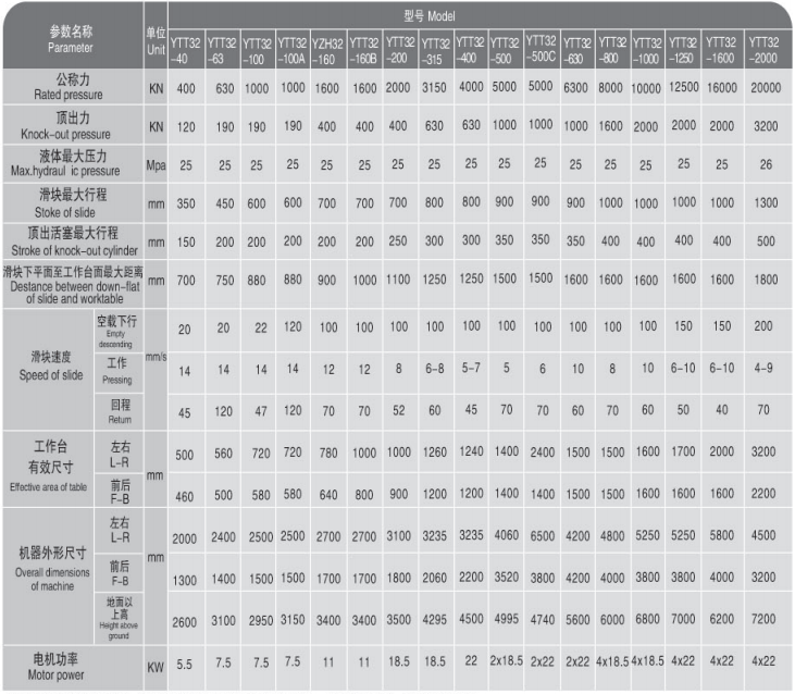 產品介紹:性能特點:計算機優(yōu)化結構設計,三梁四柱式結構,簡單、經濟、實用;液壓控制采用插裝閥集成系統,動作可靠,使用壽命長,液壓沖擊小,減少了連結管路與泄漏點;獨立的電氣控制系統,工作可靠,動作直觀,維修方便;采用按鈕集中控制,具有調整、半自動兩種操作方式;通